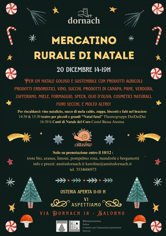 Nur auf Vorbestellung gibt's: biologische Forellen aus dem Fassatal, biologische Zitrusfrüchte aus Sizilien und Bergamotten aus Traclò! Bestellt sie jetzt (bis spätestens 10.12. an karoline@ansitzdornach.it oder Tel. +39 3534606975) und kommt sie bequem am 20. am Weihnachts-Markt in Dornach abholen (14-19 Uhr):
